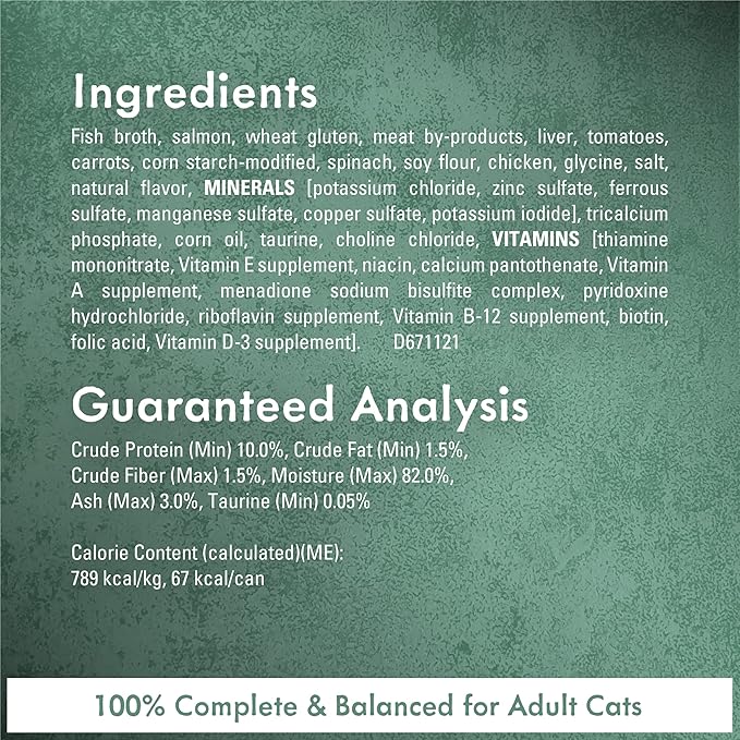 - Crafted in partnership with our expert chefs and nutritionists with real, high-quality ingredients, including real salmon, tomatoes, carrots and spinach in a silky Purina wet cat food broth