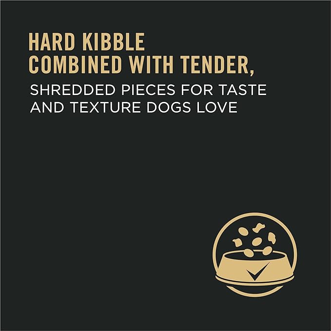 - Hard kibble combined with tender, shredded pieces for taste and texture dogs love