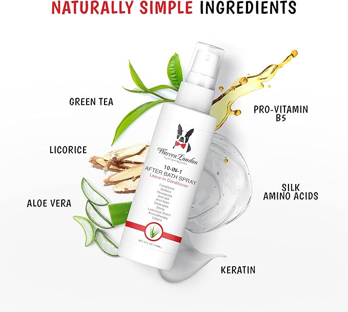 Warren London 10-in-1 After Bath Dog Spray | Leave-in Conditioner & Detangler for Dogs | Aloe Vera, Silk Amino Acids & Green Tea | Fresh Scent | 4oz Travel Size | Made in USA