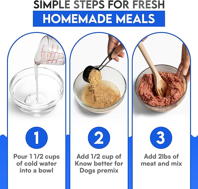 - CREATE NUTRITIOUS MEALS IN SECONDS by mixing 1 1/2 cups of cold water with ½ cup of our dog food premix, along with 2lbs of RAW or COOKED meat and optional vegetables. Witness their anticipation at mealtime, knowing a delicious meal awaits