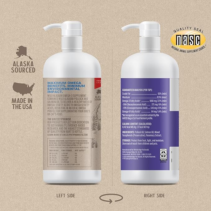 Grizzly Pet Products Omega Health Liquid Omega-3 Supplement for Dogs and Cats, 32 Ounce Bottle