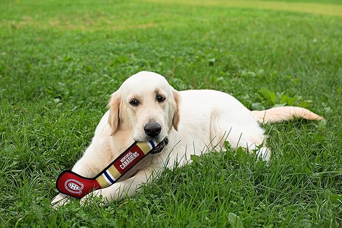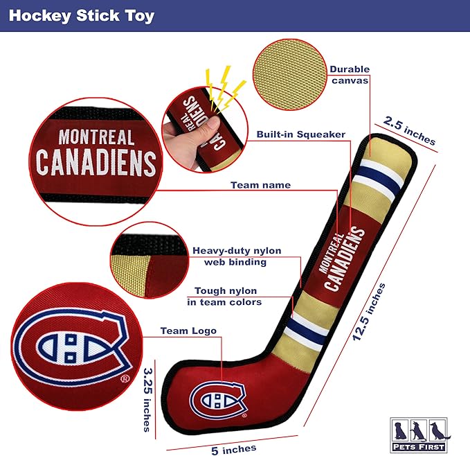 Pets First Dog Toy Tough Nylon with Inner Squeaker Licensed by NHL Montreal Canadiens Hockey Stick Toy for Dogs & Cats. Play Hockey with Your Pet with This Licensed Dog Tough Toy