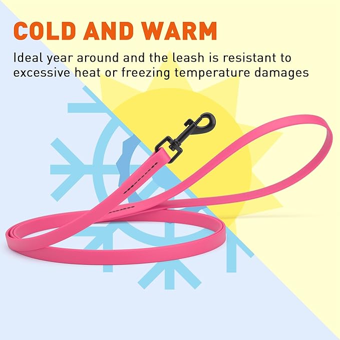 - More durable than leather dog leashes, the 4-foot and 6-foot Biothane dog leash boasts a flexible substrate core bonded with a waterproof coating, perfect for environs where strength and cleanliness are crucial. Not a chew proof material, not to be used for tie out!