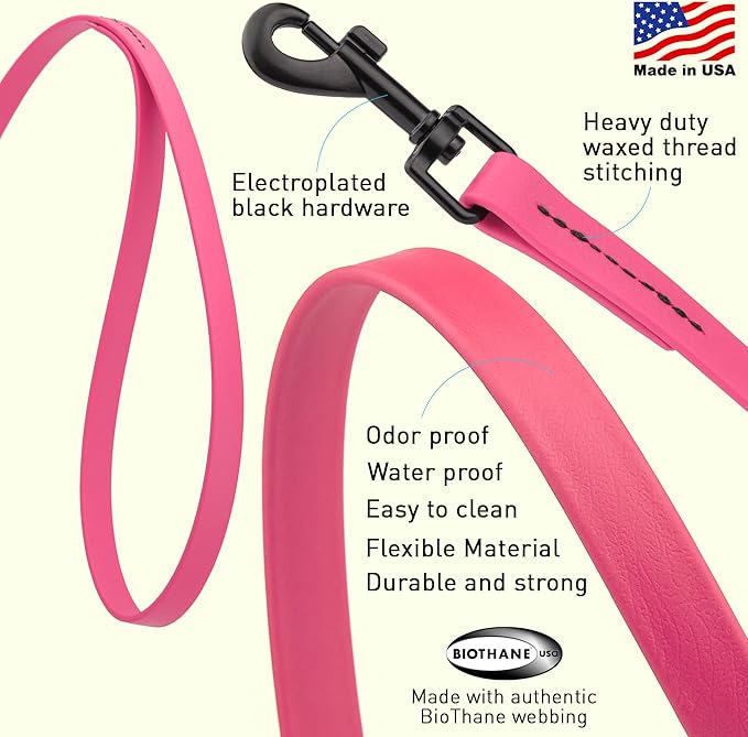 - Made in the USA from the highest quality materials, our Biothane Dog Leash comes in your choice of 26 stylish colors; 2 feet, 4 feet and 6 feet lengths; and 3 widths, ensuring that there is a suitable lead for any dog breed.
