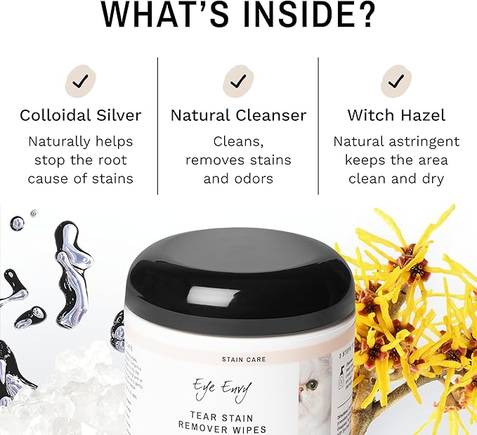 - SAFE AND NATURAL INGREDIENTS: Eye Envy Tear Stain Remover Wipes are made from non-irritating, natural ingredients that are not toxic to cats. Free from dyes, parabens, peroxide, steroids, and antibiotics. Hypoallergenic and fragrance-free. Safe for kittens.