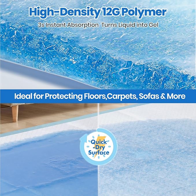 - Increased to 12g imported super absorbent polymer and fluff pulp hold more liquid up to 12 cups- With more polymer and fluff pulp than others, these puppy pads turn liquid into gel faster others to guarantee dry floors and easy clean up. Contains liquid well without going over the edges. This puppy training pads absorb and hold a lot of fluid up to 12 cups.