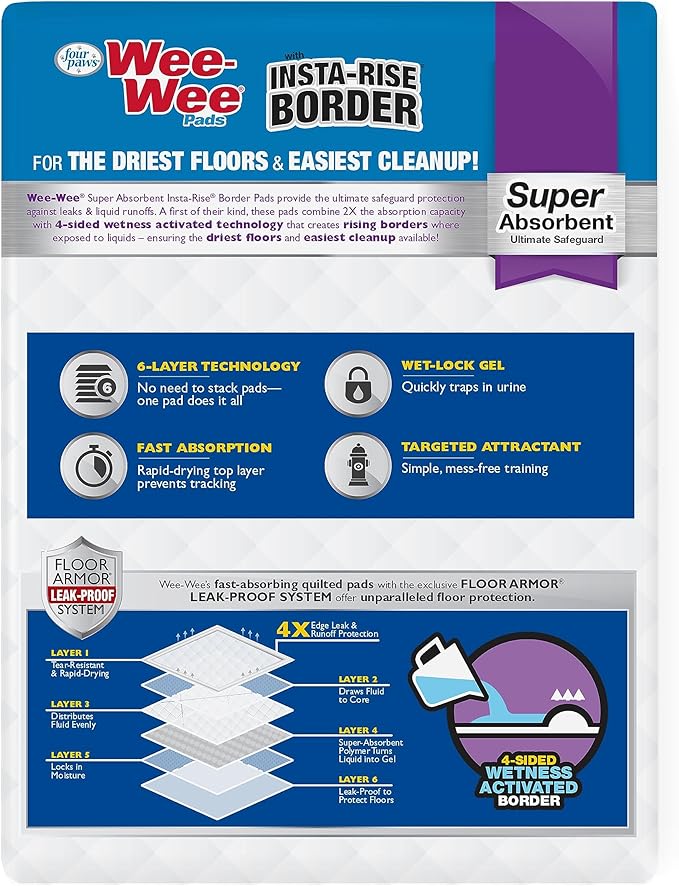 Four Paws Wee-Wee Super Absorbent Unscented Pee Pads for Dogs & Puppies with Insta-Rise Border, Leak-Proof Dog Housebreaking Potty Training Floor Protection, 22" x 23", 10 Count