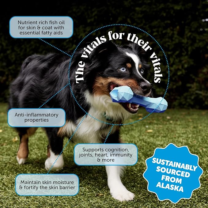 - VITAL FOR THEIR VITALS: Our fish oil for dogs is a bottleful of benefits. Essential fatty acids promote a shiny coat & healthy skin, so your pet won’t just look like best in show, they’ll feel like it too. Our dog omega-3 supplement supports brain, heart, immune & joint health as well as mobility, so your pup can play on & on. It also supports healthy inflammatory pathways, nutrient absorption, digestion & gut health. You might just say it's the overachiever of supplements.