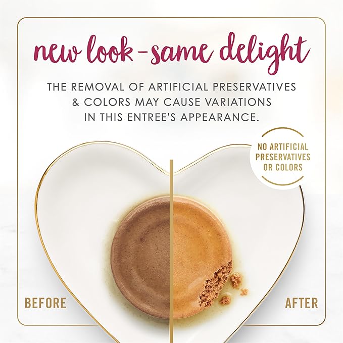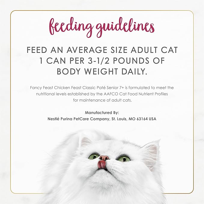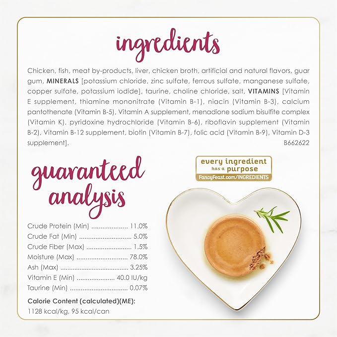 - Purina Fancy Feast senior wet cat food featuring real chicken and made without artificial colors or preservatives
