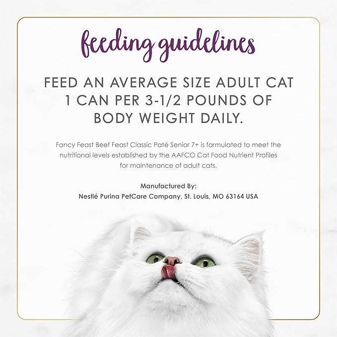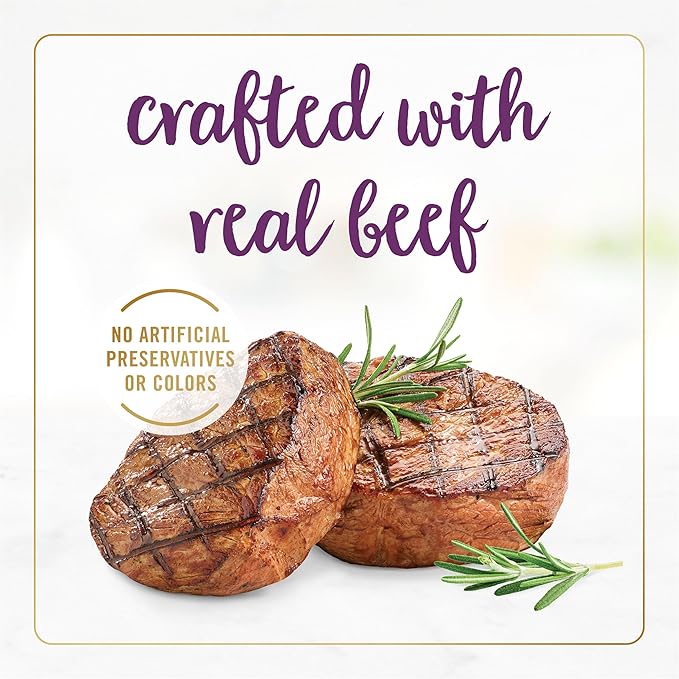 - Purina Fancy Feast senior wet cat food featuring real beef and made without artificial colors or preservatives