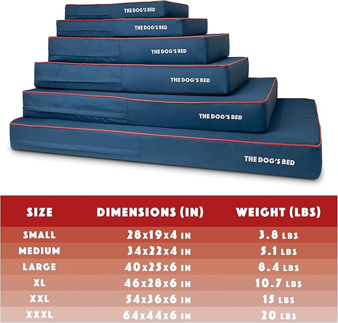 - Amazon's LARGEST DOG BED - XXXL Dark Blue with Red Trim (Easy Clean Cover) 64x44x6” waterproof orthopedic dog bed. Solid 2” high density, orthopedic memory foam over a solid 4” base of high stability support foam with covers designed so that your bed fits your home decor seamlessly and your dog can stay close to your family