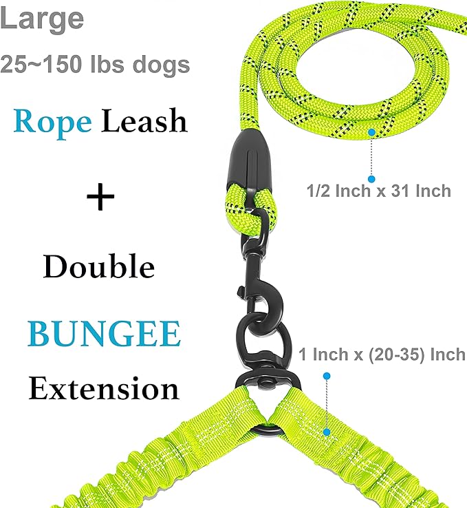- The iYoShop Double Dog Leash Advantage: 31 inch rope leash + double bungee extension (20 inches - 35 inches)