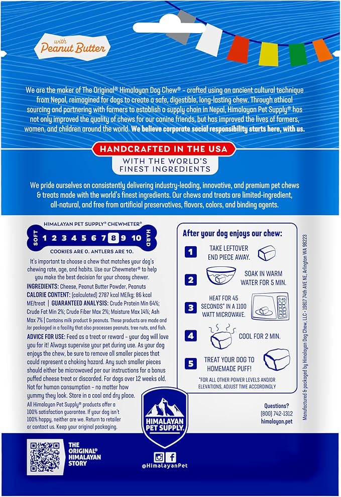 - PEANUT BUTTER FLAVOR: Included is 3 small peanut butter flavored Himalayan yak cheese sticks (1.1 oz each) - made using our traditional Himalayan cheese recipe, but with added bits of peanuts for more flavor! Ideal for dogs 15 pounds and smaller, not for dogs younger than 12 weeks.