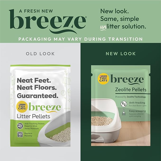 - Breeze Litter Pellets: Unscented cat Zeolite litter pellets allow urine to pass through and dehydrates and leaves solid waste on the top for powerful odor control and easy scooping.