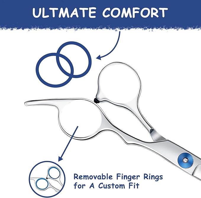 - Ergonomic Design: This dog grooming scissors designed with safety round tip, not hurting fingers after long time usage.Easy to hold and use. The plastic finger rings are removable for cleaning or extra space.It is also removable, for different finger sizes use.
