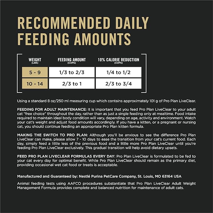 - Purina Pro Plan LiveClear Cat Food Weight Management and Cat Allergen Reducer Chicken and Rice Formula reduces the major allergen in cat hair and dander, while helping maintain weight.