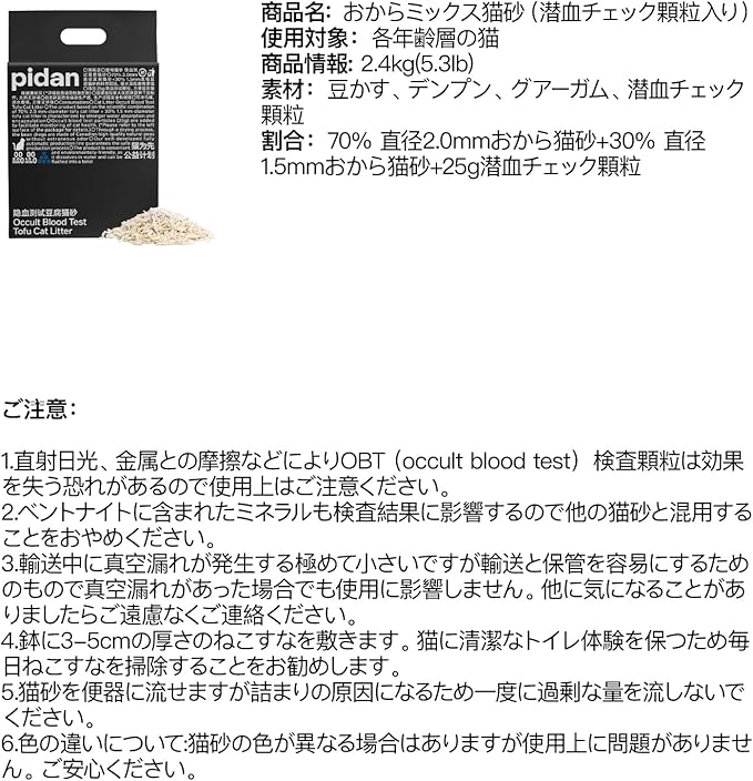 - 【Attention】 1.Direct exposure to hard light or friction with metal would invalid the detection function of the occult blood test particles. Please avoid such situations.2.Mineral substance contained in bentonite would affect the detection performance. Do NOT mix the product with other cat litter. 3.The vacuum design is only to facilitate its transportation and storage, and air leakage does NOT compromise the use. If you DO mind, please contact us.
