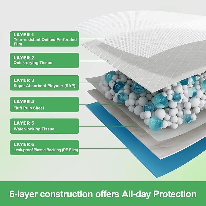 - Super Absorbent & Quick Drying: DEEP DEAR's 6-layer protection design makes our thickened large dog training pads are much more absorbent than most wee wee pee pads for dogs on the market. The dog pee pad uses new premium material perforated film as the top layer of the puppy potty pad which can speed up the liquid to pass through the surface than common non-woven fabric and keep the surface quick-drying, comfortable, no puddling, and no tracking.