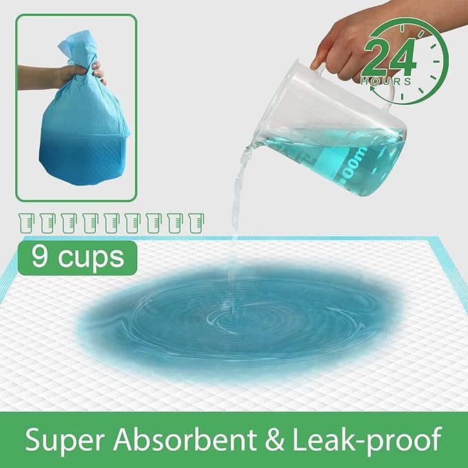 - Leak-proof Protection to Keep Your Home Clean: Each of large dog potty pads features the new upgraded plastic backing (thickened PE film) which is much more leak-proof, tear-resistant, and durable than most pet training pads in the market as the last-layer of the puppy pads. It can protect your floors, carpets, sofas, chairs, mattresses, beds, etc. from the urine damage by blocking leaks. It holds up to 12 cups of liquid.