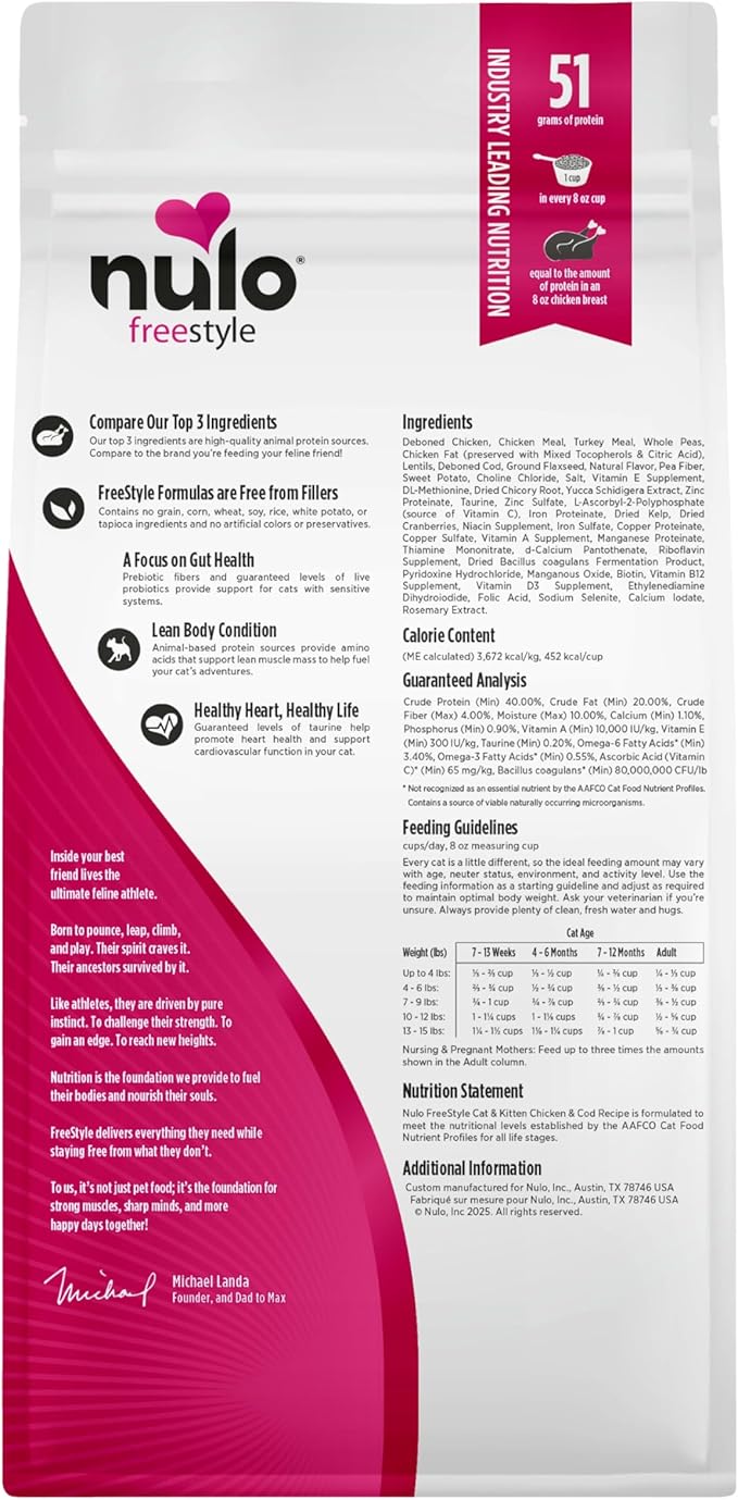 Nulo Freestyle High Protein Cat & Kitten Food, Chicken & Cod Recipe - Natural Grain-Free Dry Cat Food with Omega Fatty Acids & Probiotics, 2 lb Bag