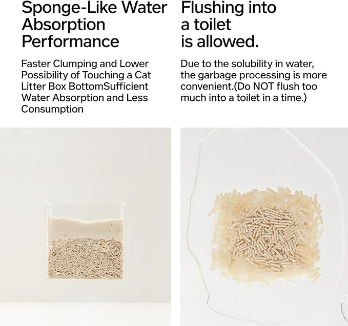 - 【Selected Quality Pea Dregs】Sponge-Like Water Absorption Performance.Faster Clumping and Lower Possibility of Touching a Cat Litter Box Bottom.Sufficient Water Absorption and Less Consumption.