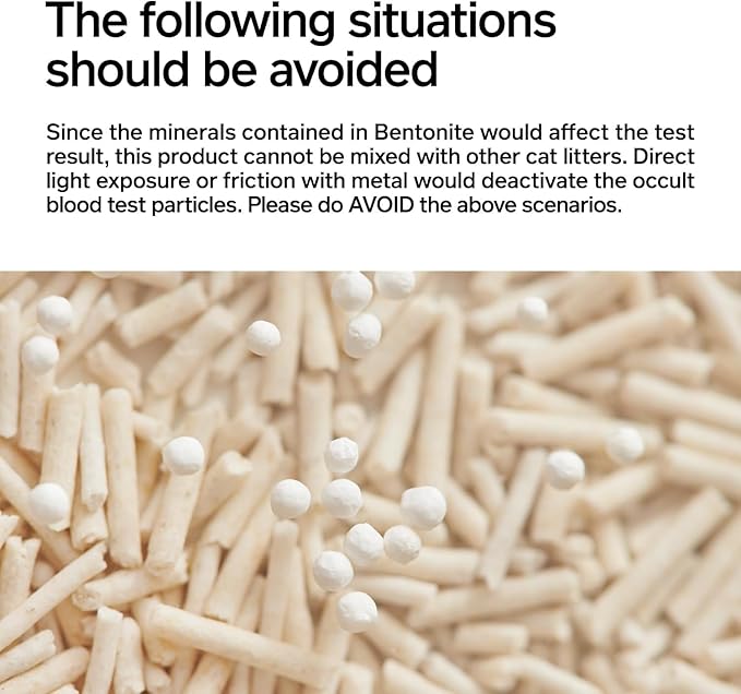 - 【Attention】 1.Direct exposure to hard light or friction with metal would invalid the detection function of the occult blood test particles. Please avoid such situations.2.Mineral substance contained in bentonite would affect the detection performance. Do NOT mix the product with other cat litter. 3.The vacuum design is only to facilitate its transportation and storage, and air leakage does NOT compromise the use. If you DO mind, please contact us.