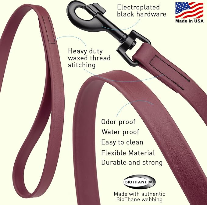 Dogline Biothane Waterproof Dog Leash Strong Coated Nylon Webbing with Black Hardware Odor-Proof Easy to Clean High Performance for Small or Large Dogs Made in USA 4 or 6 ft Lead, Merlot Burgundy