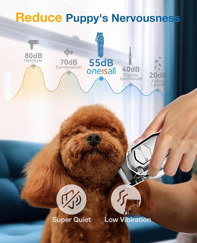 - ๐๐จ๐ฐ ๐ง๐จ๐ข๐ฌ๐ & ๐๐จ๐ฐ ๐๐ข๐๐ซ๐๐ญ๐ข๐จ๐ง ๐๐๐ฌ๐ข๐ ๐ง๏ผThe noise of the dog clippers is lower than 55db when running. Low noise won't make your dog scared and youโll be able to trim its coat with ease and much faster