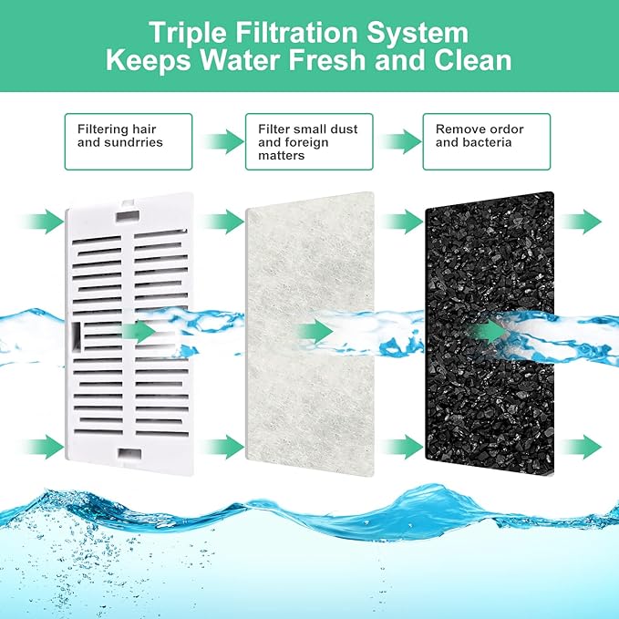 - 🐕【 Triple Filtration System】Cat water fountain filter is made of 3 layer filtration system, Double-sided ABS grid can filter hair and large impurities, Non-woven fabric could filter small sediment and debris, activated carbon powder layer remove chlorine and odor, keep water fresh and healthy for your pets, effectively prevent kidney disease.