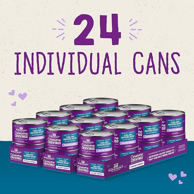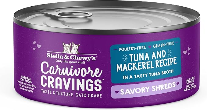 Stella & Chewy's Carnivore Cravings Savory Shreds - Wet Cat Food - High-Moisture Formula with Wild-Caught Tuna & Mackerel - Perfect for Picky Eaters - 2.8 oz, 24 Count