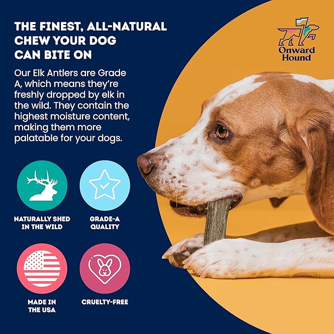 Onward Hound Elk Antlers for Dogs, 7"+ Large 3-Pack, Grade A Long Lasting Chew for Aggressive Chewers, Premium USA Naturally Shed Antler - Healthy, No Odor, Durable Dog Chew for 30-65lb Breeds