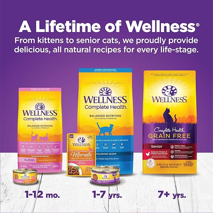 - COMPLETE & BALANCED NUTRITION: Created by nutritionists & veterinarians, each Wellness(r) recipe is carefully crafted to provide the necessary protein-rich, daily nutrition from natural ingredients that your cat is sure to love. Catisfaction Guaranteed.