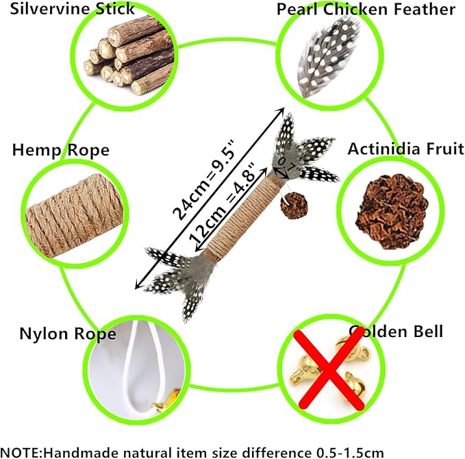 - 3.[Cat Teaser Toy with Feather]:This kitten treats for indoor kitten contains exciting durable string which makes cat chew toys for aggressive chewers more resistant to bites, dried & strong silvervine wood stic, lickable actinidia fruit. To increase the cat's interest in cat dental toy, we have added beautiful feather to teasing cat.Real fur will make cat very excited & playful, release the pressure in the process of playing & make the mood better.