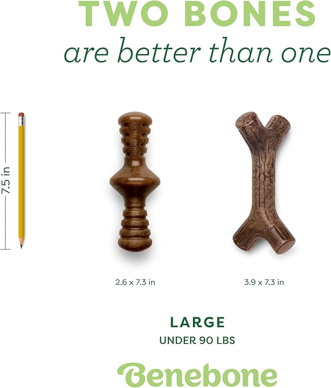 - EASY TO PICK UP AND CHEW – Our Maplestick and Zaggler are uniquely shaped for a paw-friendly grip so your pup can quickly grab them and get a good chew going. Think about it: dogs don’t have thumbs. DURABLE, LONG-LASTING – Benebones are tougher than real bones and last for weeks.