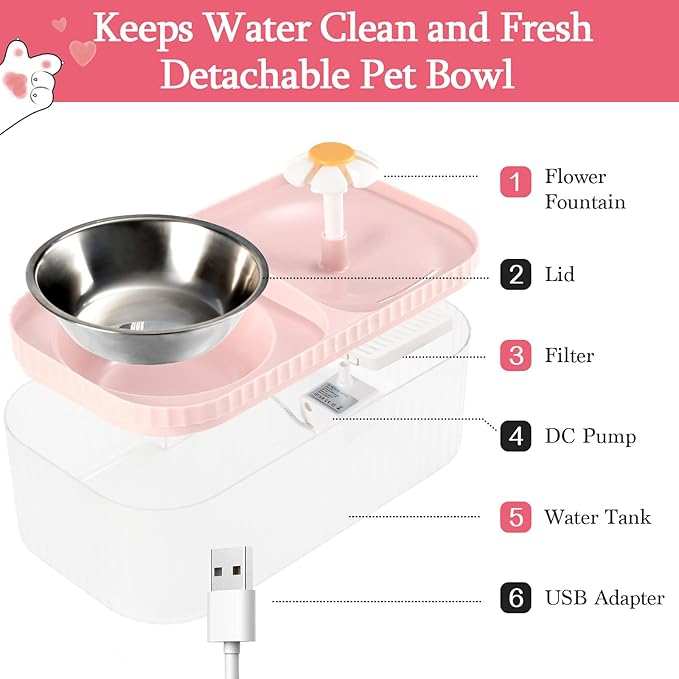 - 【Easy to Install & Clean】Cat fountain water bowl is easy to assemble. BPA-free dishwashers are safe and easy to clean. For your pet's health, we recommend changing filters and cleaning the pump and fountain every 2-3 weeks. Made from superior quality non-toxic and odor-free plastic materials, the pet fountain will last for years of everyday use. It includes a quadruple filter and a small energy-efficient pump with a power cord.