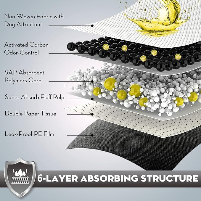 - Innovative 6-Layer Super-Absorbent Design: Six layers including a non-woven top layer for rapid absorption; diamond quilted pattern directs liquid flow; activated carbon layer eliminates odors; super-absorbent polymer core holds 4 to 12 cups of liquid; waterproof PE backing prevents leaks and floor damage