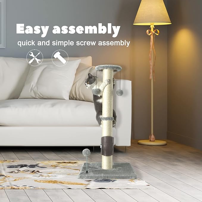 PEEKAB 32" Tall Cat Scratching Post Sisal Scratch Posts with Hanging Ball and Self-Massage Brush Vertical Scratcher for Indoor Cats and Kittens Light-Gray 32inches