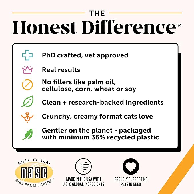 - THE HONEST DIFFERENCE: Our products are made with clean, science-backed ingredients for results you can trust, & with no fillers, artificial preservatives, colors, or flavors, you'll have no doubt your cat is getting the best. Proudly supporting pets in need nationwide & using recycled plastic in our packaging, there's also no doubt that we're committed to doing our best. -- All products are manufactured in the U.S.A. | NASC Member Company
