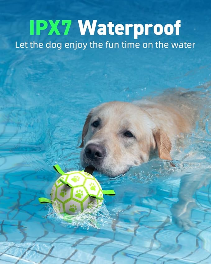 - [ Upgrade Outdoor Dog Toys] Premium Dog soccer ball with nylon straps sewn evenly into the seams not only create an erratic bounce that dogs love to chase, but also make it easier for the dogs to throw, fetch, tug and retrieve in yard. Dog paws are printed evenly on the dog toys ball to attract dog's attention. There's a longer strap for people to hold onto the ball, making it a great interactive dog toy to train your dogs