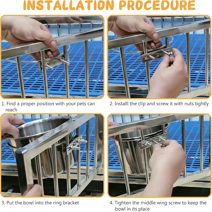 - 【Anti-Spill】Wide-mouth design with a ring bracket help dog bowls for crate to reduce spilling. The middle wing screw can lock the bowl securely in its place, you don’t need to worry the bowl will tip over resulting in your pets being wet or messy in cage.