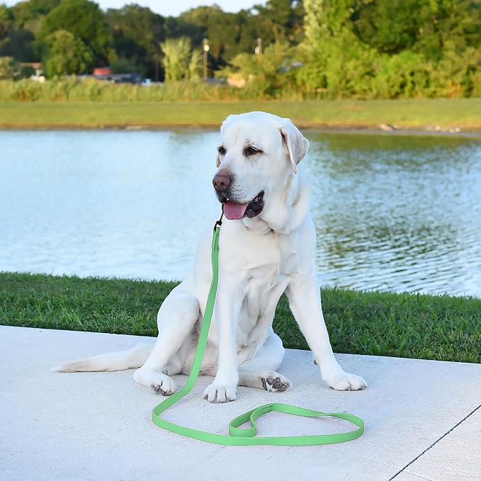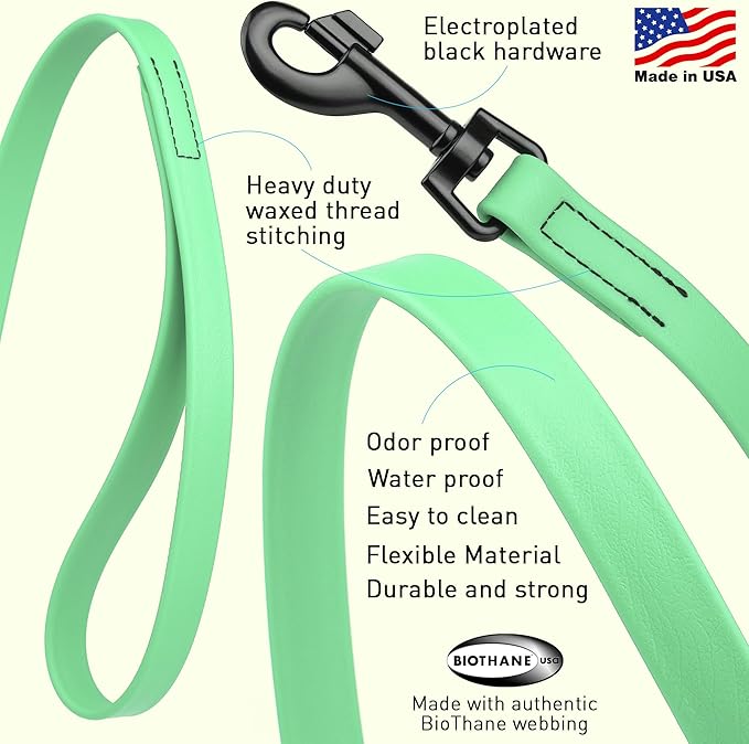 - More durable than leather dog leashes, the 4-foot and 6-foot Biothane dog leash boasts a flexible substrate core bonded with a waterproof coating, perfect for environs where strength and cleanliness are crucial. Not a chew proof material, not to be used for tie out!