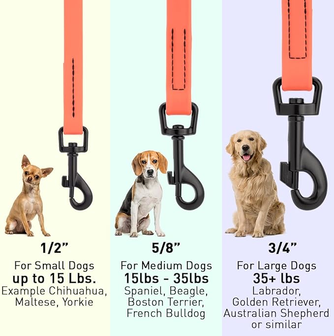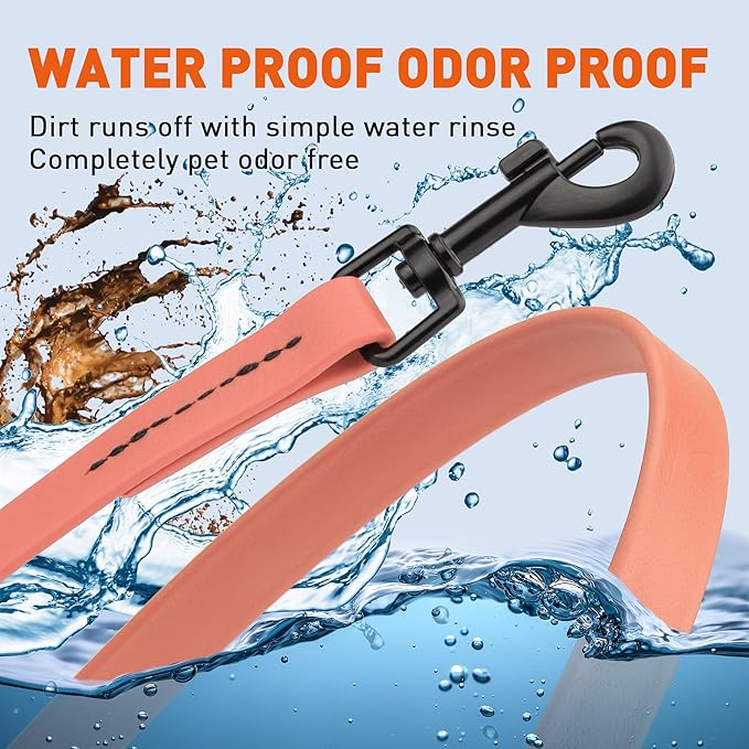 - More durable than leather dog leashes, the 4-foot and 6-foot Biothane dog leash boasts a flexible substrate core bonded with a waterproof coating, perfect for environs where strength and cleanliness are crucial. Not a chew proof material, not to be used for tie out!