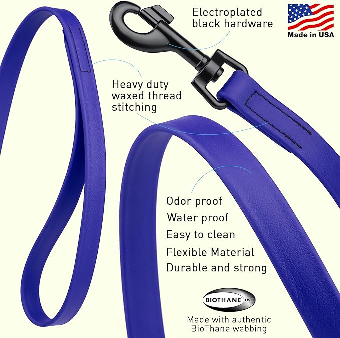 Dogline Biothane Waterproof Dog Leash Strong Coated Nylon Webbing with Black Hardware Odor-Proof Easy to Clean High Performance for Small or Large Dogs Made in USA 4 or 6 ft Lead, Blueberry Royal
