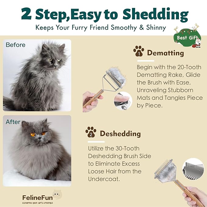 FelineFun Cat Brush for Dematting & Deshedding, 2 in 1 Undercoat Rake, Efficiently Remove Loose Hair & Matted Fur, Professional Shedding Comb for Indoor Cats & Long Haired Cats