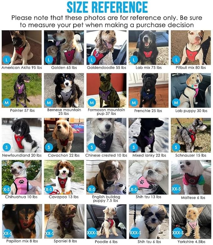 - EASY TO USE AND QUICK RELEASE --- There are two buckle on the chest part, which make the harness easy to put on and no need dogs to step in. And the four adjust buttons on the harness strap, can be easily adjusted to make your fur friend feel comfortable, and suitable for all small, medium and large size dogs, or even kitten cats and medium cats.