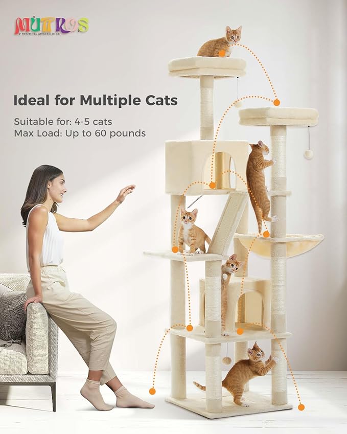 - [Multi-Level Cat Playground]: Designed with multiple levels, this 70.9" tall cat tower provides ample vertical space for your cats to explore and satisfy their natural instincts and activity needs. This cat tree features 6 scratching posts, 2 scratching boards, 2 pompoms, 2 condos, 1 hammock, and 2 perches, catering to the various needs of multiple cats simultaneously.