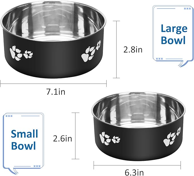 - 2 DIFFERENT SIZE BOWLS: The dog crate water bowls comes in 2 different sizes, the big one is 7.1*2.8in; the small one is 6.3*2.6in, both are with elegant black coating. Distinguishable for food and water bowls apply for small-Large dogs, adult cats, kittens, rabbits, guinea pig...