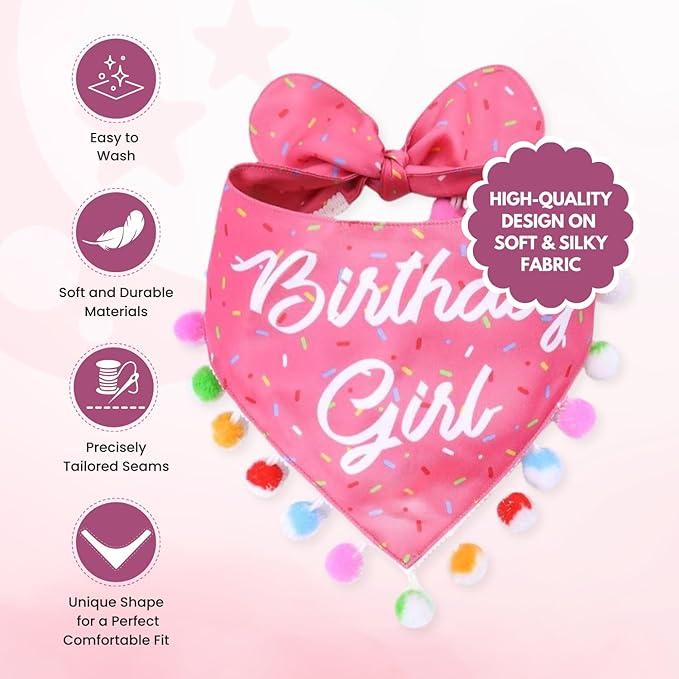 LunaMarie - Luxury Pet Birthday Bandanas -Premium & Silky Poly Fabric | 100% Handmade | Custom Shape Dual Layered (Birthday Girl, Medium)