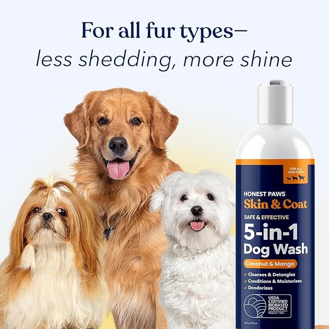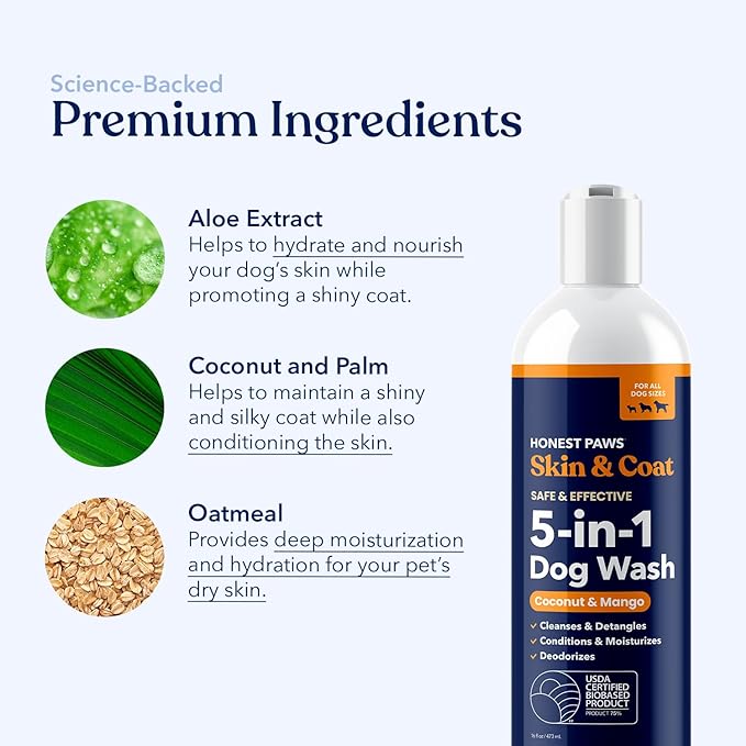 - Five Benefits In One Wash - Cleans, deodorizes, conditions and detangles coat, moisturizes skin-- Honest Paws Skin and Coat 5-in-1 Dog Wash is a one-step and easy to use premium dog wash. It is all you need to keep your dog’s fur and skin soft, moisturized and clean.