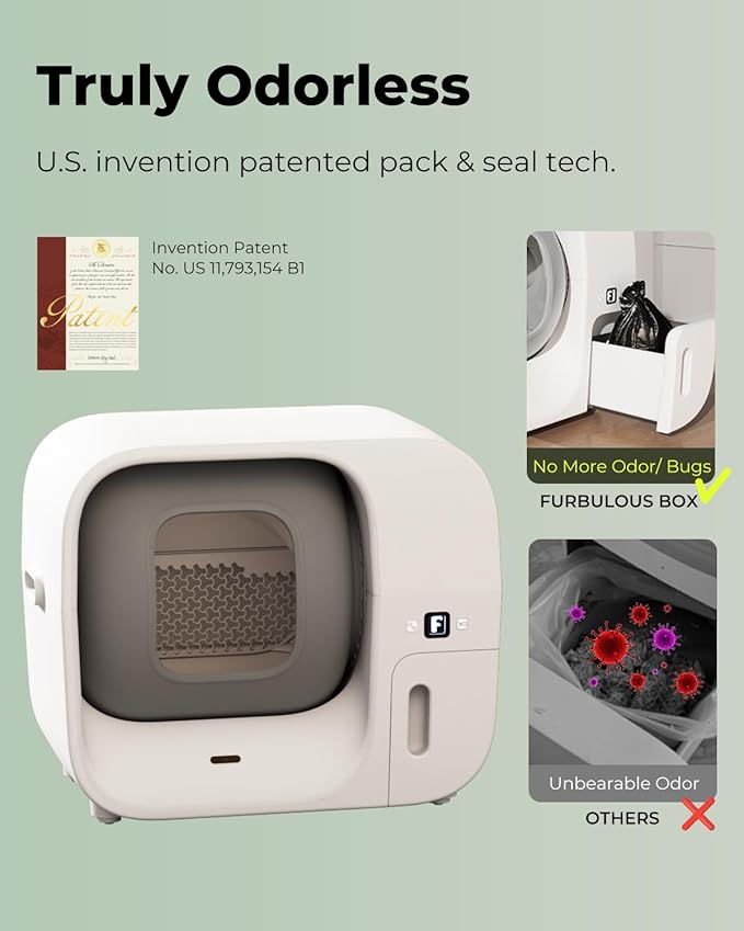 - WORLD'S FIRST SELF-PACKING AND REFILLING LITTER BOX: The Furbulous Box is the world's first cat litter box that truly achieves automatic packing and refilling of trash bags, keeping all waste sealed and eliminating odors and germs leakage for a healthier home environment